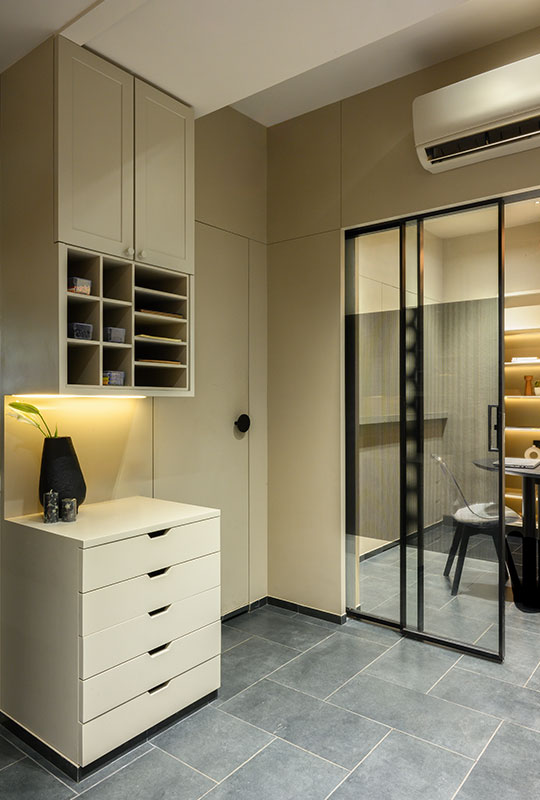 The 400 sq.ft office is intelligently planned to maximize the open layout while ensuring that each function retains its unique space. This design facilitates a multipurpose use of the office, allowing flexibility for various activities.