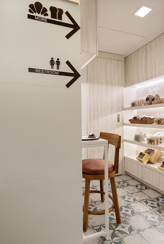 The café is contained in a tight floorspace of 300 SQ.FT. The exposed brick wall furthers the vintage expression as do the printed floor tiles. Together, they add a minimal but effective touch of ornamentation. The Parisian Street finds its way into the café in the form of signages and accents. The overall colour scheme of white allowed us to experiment with motifs, yet create an oasis of calm and solitude.